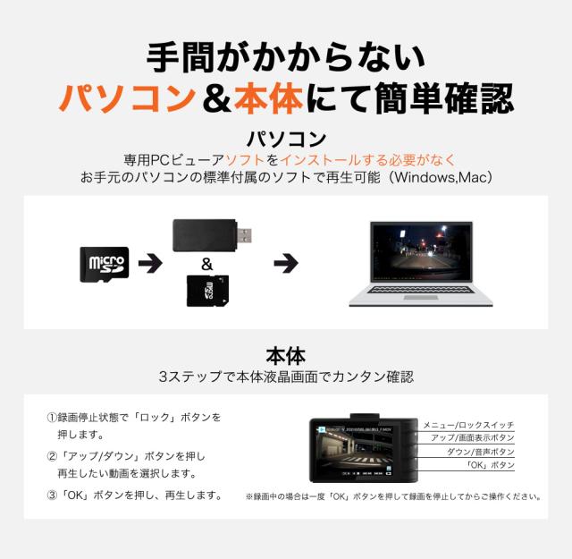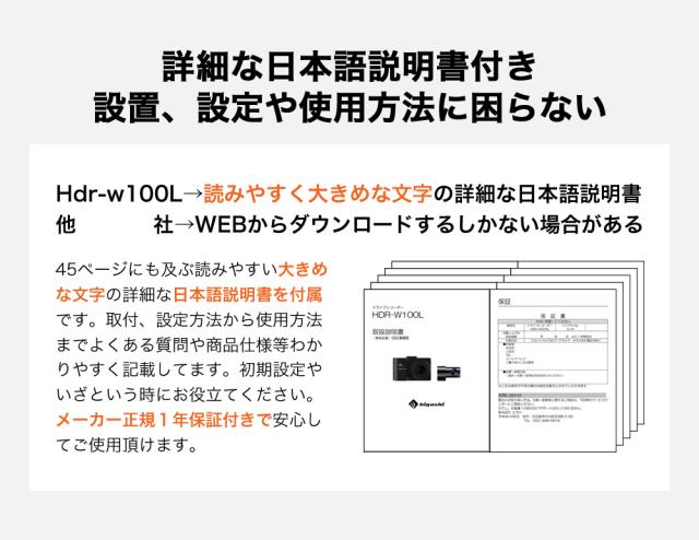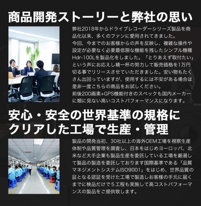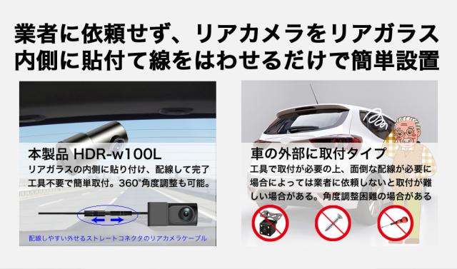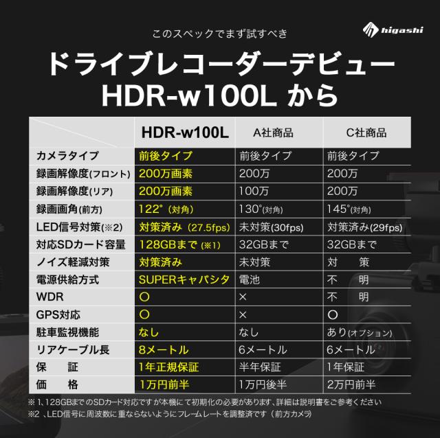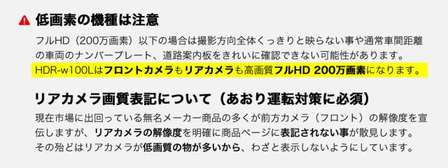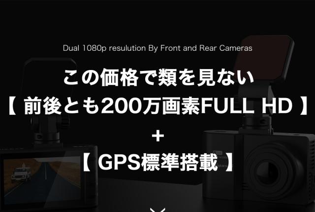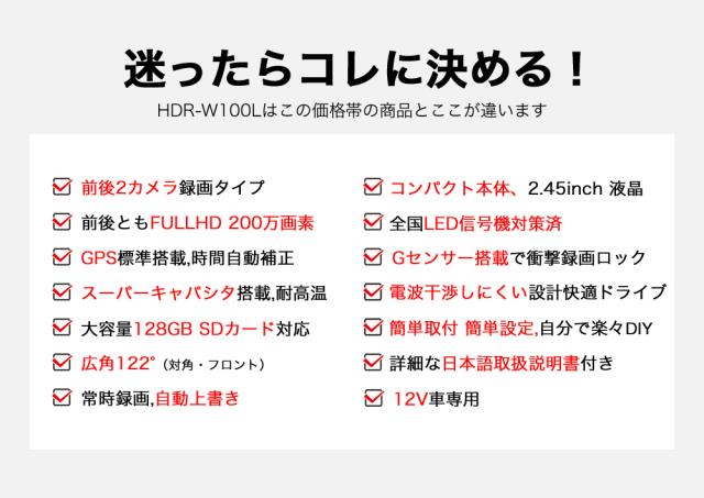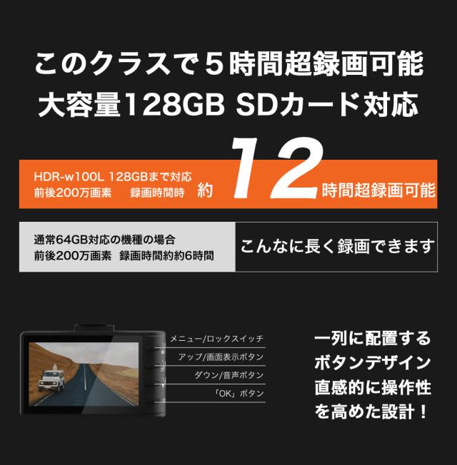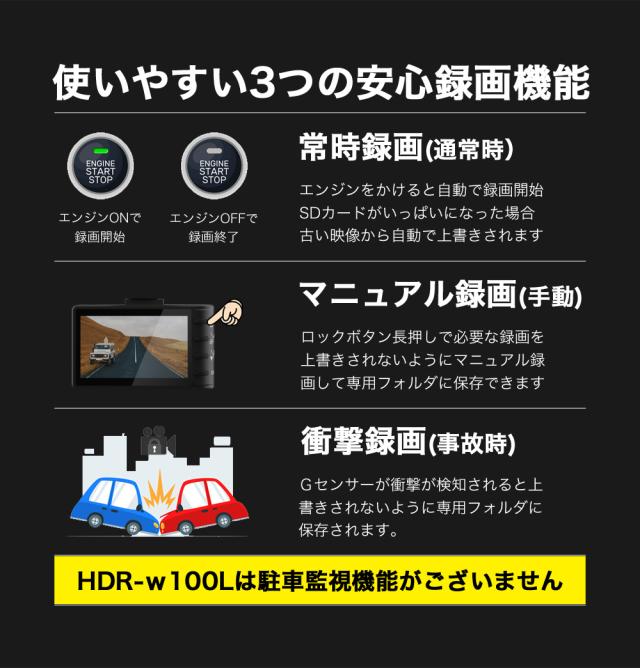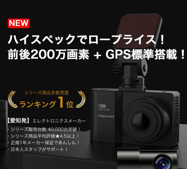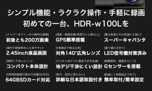 ハイスペックでロープライス!前後200画素 + GPS標準搭載でシンプル機能・ラクラク操作・手軽に録画可能になります。この価格で類に見ない自信を持ってお勧めします!!世の中にあるたくさん機種選びにお悩みの方や初めてのドライブレコーダーを付けて見たい方はは是非、HDR-w100Lを!