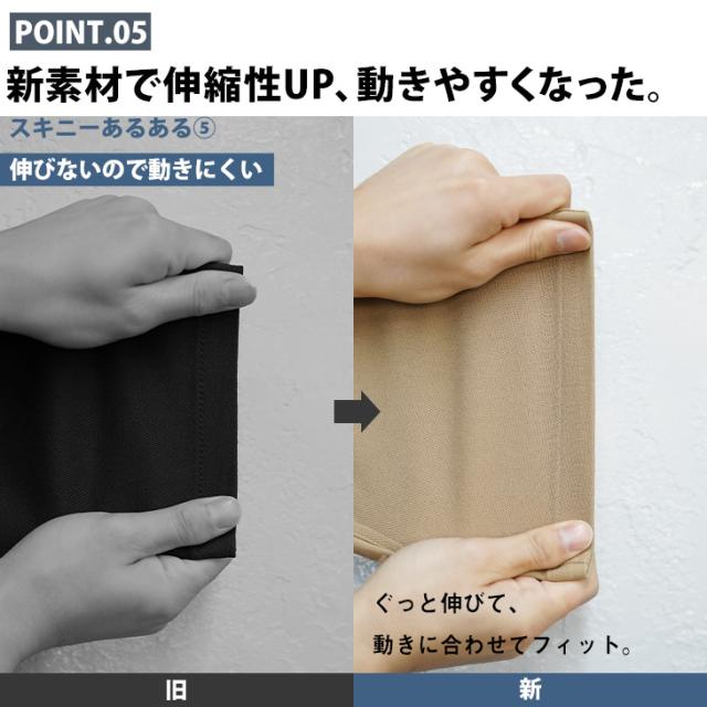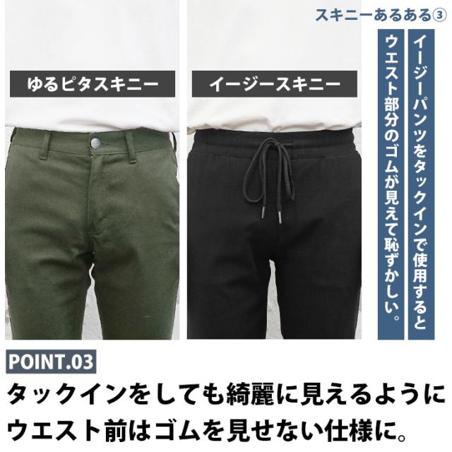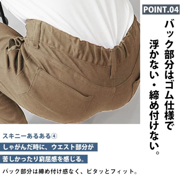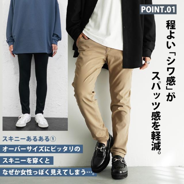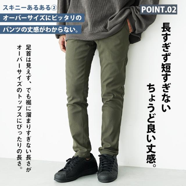 スキニーパンツらしいピタッと感ある見た目と、窮屈さを感じさせないゆるっと感を両立した新常識のスキニーパンツ。脚の形を拾わないサイズ感が程よくシワを生み出し、スパッツのように見えてしまう問題を改善。さらにウエストのバック部分はゴム仕様になっているので着脱も容易に。あらゆるストレスを軽減した新時代のスキニーパンツです。