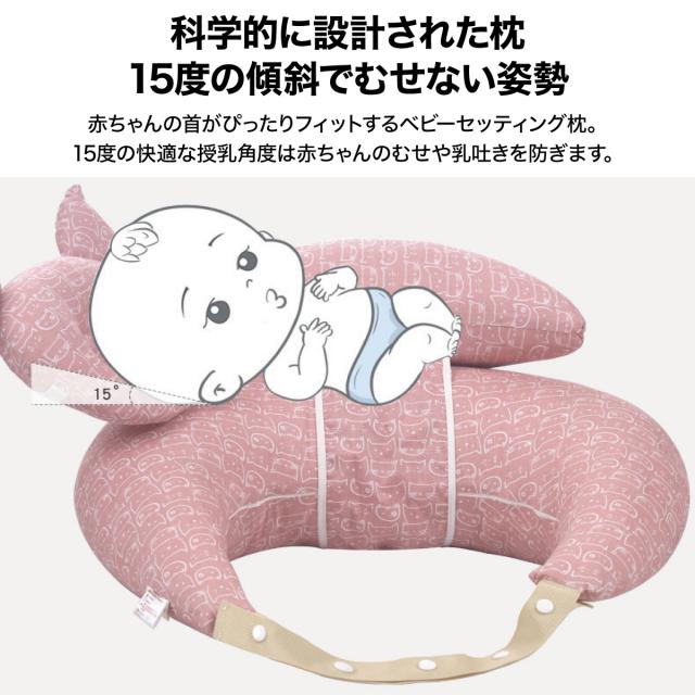 赤ちゃんの首がぴったりフィットするベビーセッティング枕。15度の快適な授乳角度は赤ちゃんのむせや乳吐きを防ぎます。
