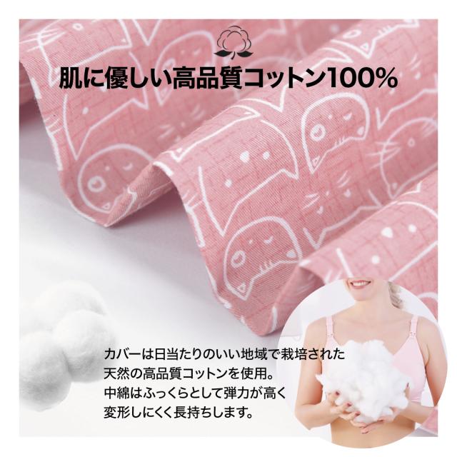 カバーは日当たりのいい地域で栽培された天然の高品質コットンを使用。中綿はふっくらとして弾力が高く変形しにくく長持ちします。