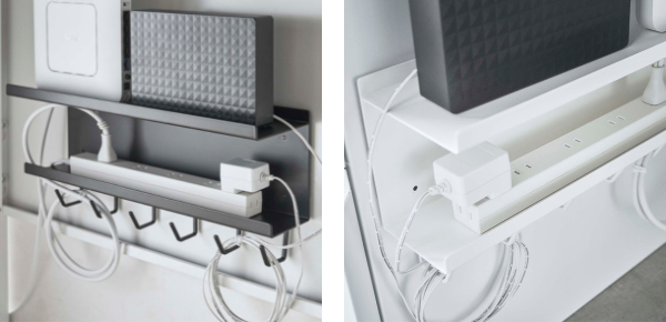マグネットか石こうボードピンで設置するので、ケーブルやルーター、タコ足配線などを浮かせて収納できます。机下のデッドスペースを有効活用できてオススメです。浮かせて収納しているので床掃除がラクです。