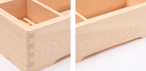 | 「ホゾ組構造」で衛生的 釘やネジを使用しない「ホゾ組構造」で、錆びが出る心配もないので、衛生的にお使いいただけます。 | 重心が安定する四つ脚加工 脚にはくぼみ加工が施されている為、脚の裏全体が床につかず水に触れる面積を減らすことで重心を安定させてくれます。 |