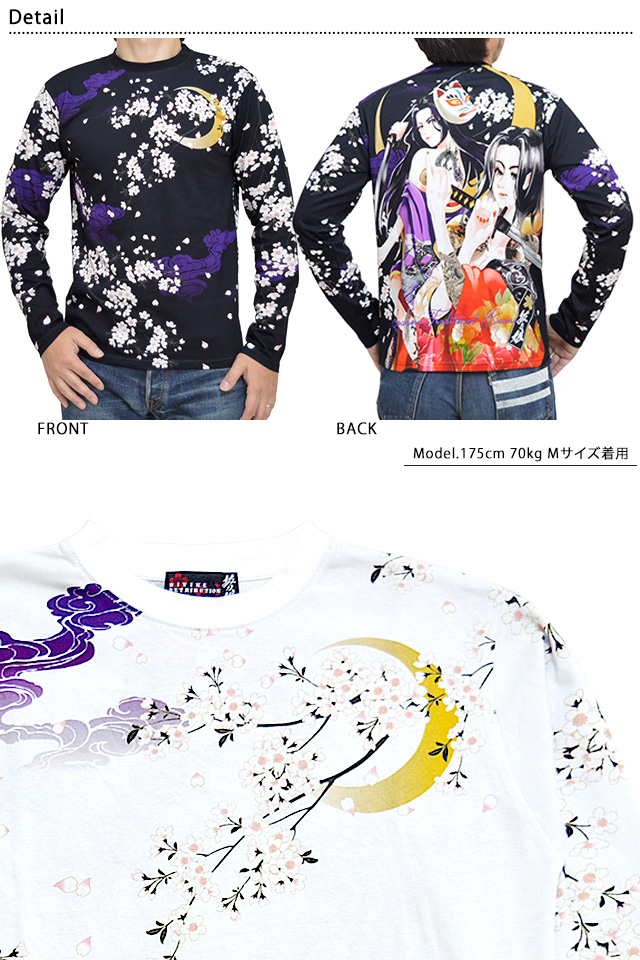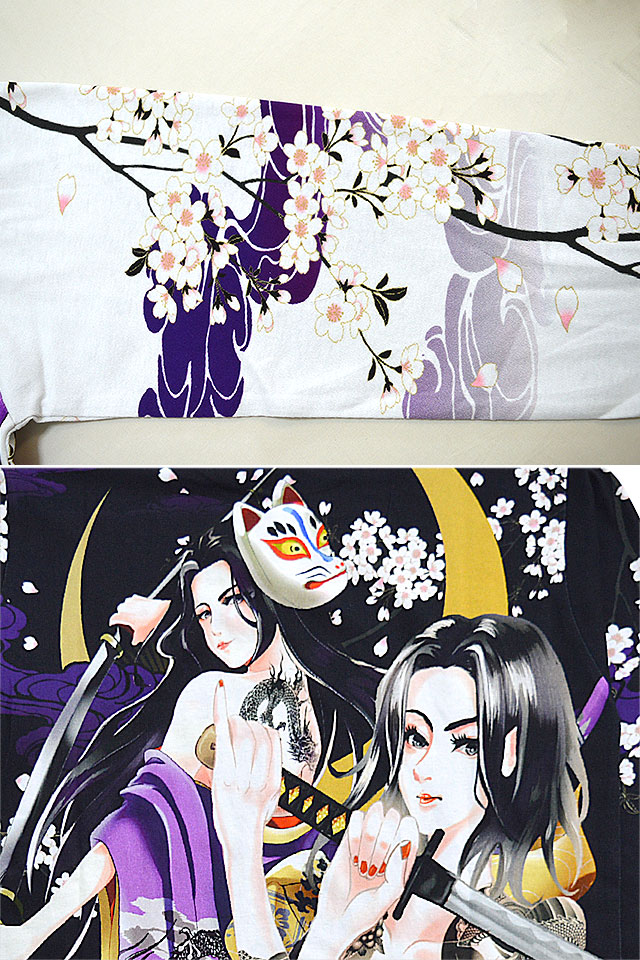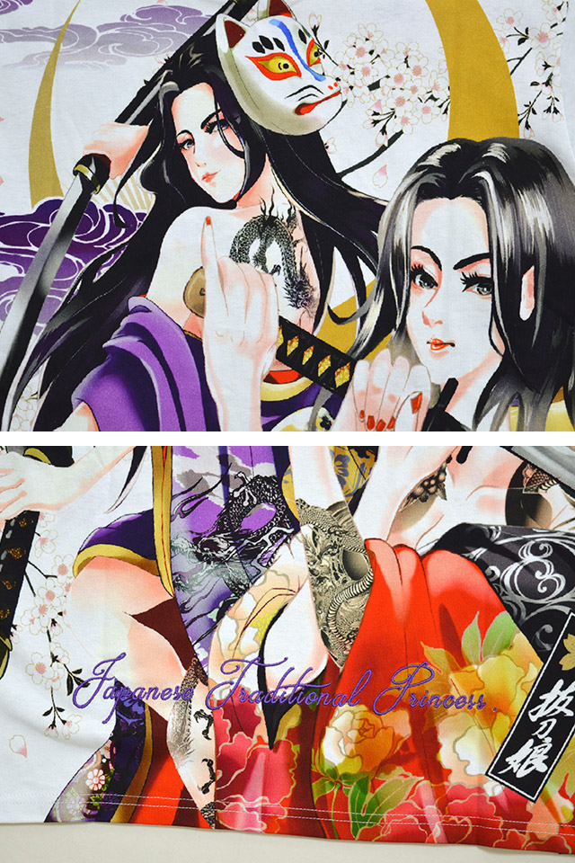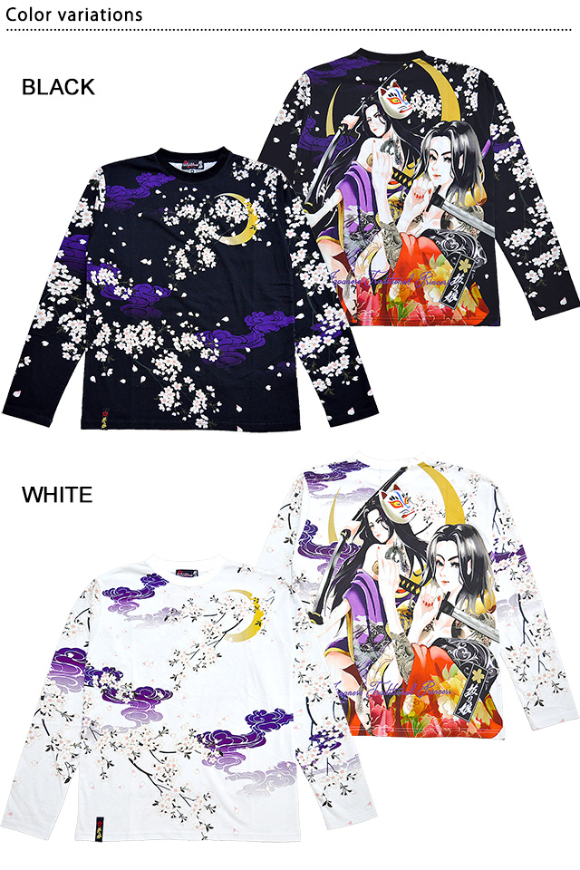 絡繰魂の姉妹ブランドとして誕生した、従来の和柄から抜け出し、和の持つ美しさを融合させた【抜刀娘】から「抜刀娘 結愛&葵長袖Tシャツ(213872)」のご紹介です。 今回はいつもの抜刀娘デザインとは一味違う! ボディーには、綿100%のさらりとした柔らかなTシャツ生地を使用。 | |||||||||||||||||||||||||