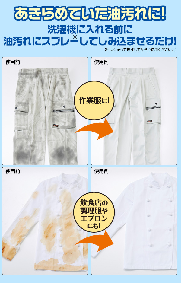業務用 作業着の油汚れ落としスプレー 150ml 油よごれ洗剤 衣類用 強力 プロ 油落とし 洗濯洗剤 部分洗い 作業服 作業着 調理服 エプロン つなぎ 作業着洗い洗剤