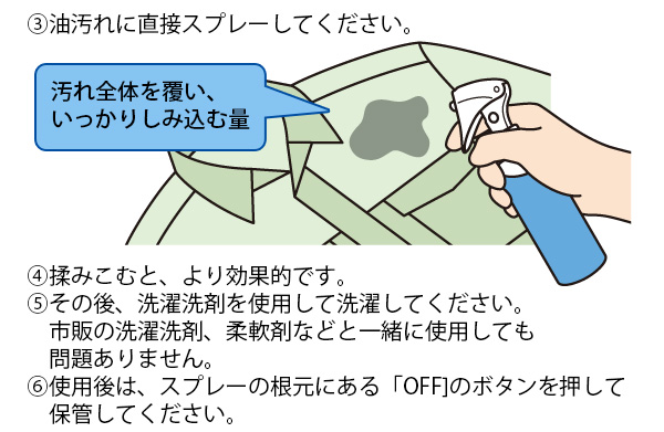 洗濯機に入れる前に油で汚れた衣類にスプレーしてしみ込ませるだけ!