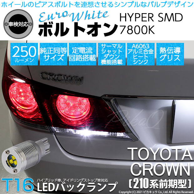 LED,ピカキュウ,LED専門店,LEDバルブ,T16ウェッジ,T16 NEW ボルトオンSMD,250ルーメン,蒼白色 7800K,青白色,EURO WHITE,ユーロホワイトバックランプ,後退灯,トヨタ,210系クラウン,クラウン,アスリートハイブリッド,TOYOTA,CROWN ATHLETE HYBRID,210系,AWS210,前期