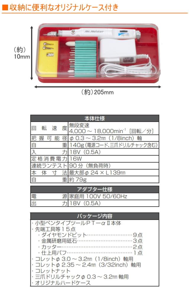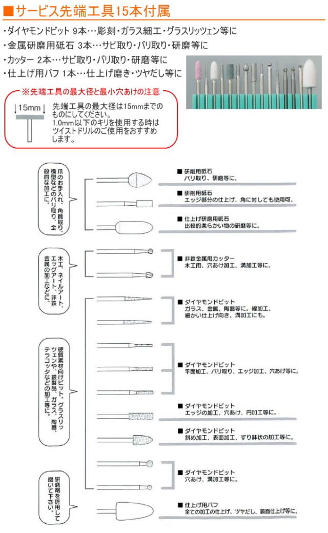 | パッケージ内容 | 小型ペンタイプツール本体 先端工具15点 ・ダイヤモンドビット×9点 ・金属研磨用砥石×3点 ・カッター×2点 ・仕上げ用バフ×1点 コレットΦ3.0〜3.2mm(1/8inch)軸用 コレットΦ2.35〜2.4mm(3/32inch)軸用 コレットナット 三爪ドリルチャックΦ0.3〜3.2mm軸用 オリジナルハードケース |