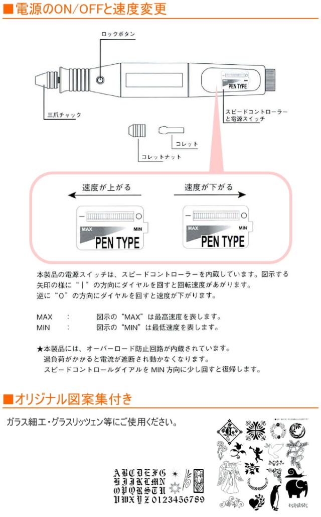 | 特徴 | より身近に、より自由に。創作の幅を広げる小型ペンタイプツール。 模型製作・ネイルアート・グラスリッツェン・木彫・彫金などの軽作業に最適な、細身で握りやすいペンタイプのグラインダーです。 スレンダーで使い易く、しかも無段変速で、コレット交換が簡単。 あらゆる作業がお楽しみ頂けます。 0.3〜3.2mmまでの日米欧のほとんどの先端工具が使用できますので、大変便利で作業の幅を限りなく広げます。 ※沖縄・離島へのお届けはできません。 |