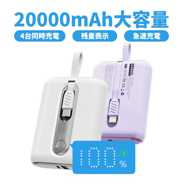 \BlackFriday★2400円→1200円/モバイルバッテリー 20000mAh 大容量 2ケーブル内蔵 コンパクト&軽量 小型 4台同時充電 PD20W 電量残量表示 PSE 旅行/出張
