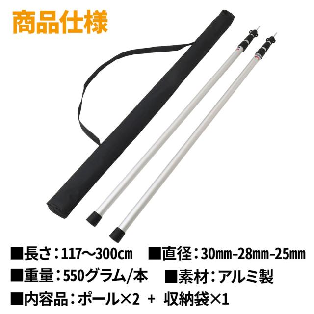 テントポール アルミ製テントポール 2本セット 2本 直径 30mm28mm25mm 高さ 117 - 300 cm 無段階 高さ調整 アルミ