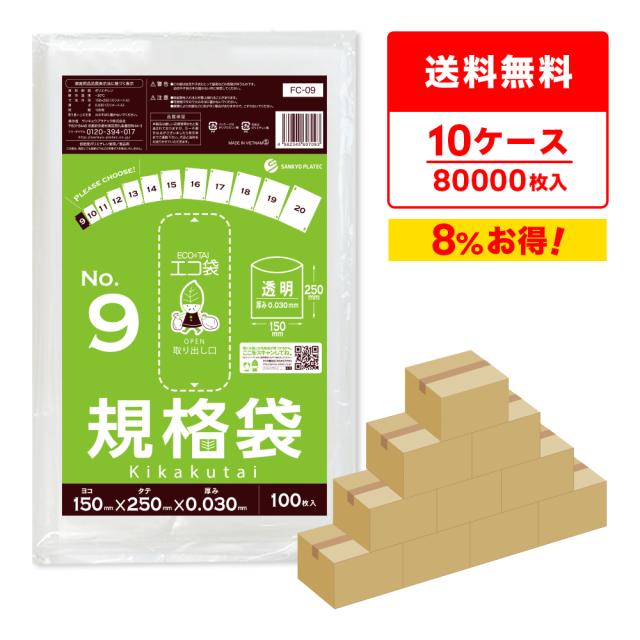 【まとめて10ケース】FC-09-10 規格袋 9号 0.030mm厚 透明 100枚x80冊x10箱 食品衛生法 RoHS指定 送料無料