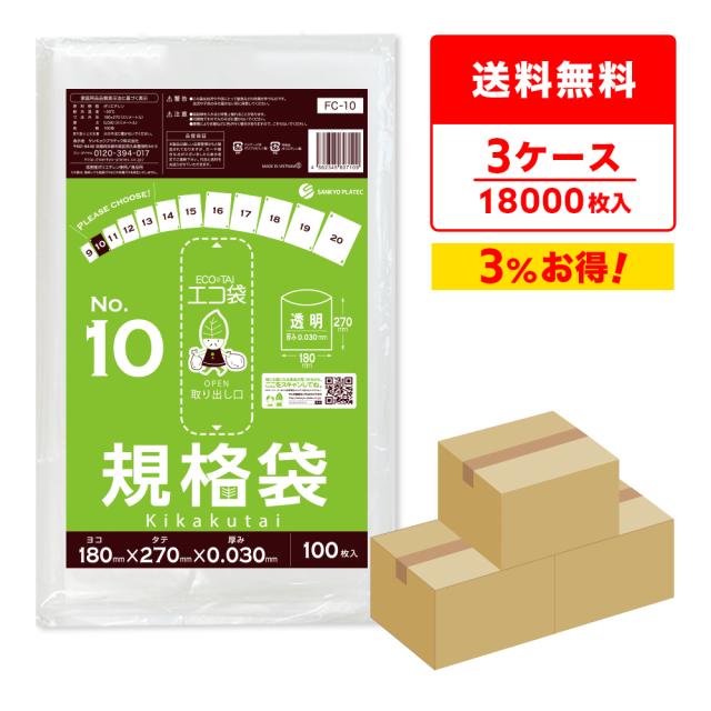 【まとめて3ケース】FC-10-3 規格袋 10号 0.030mm厚 透明 100枚x60冊x3箱 食品衛生法 RoHS指定 送料無料