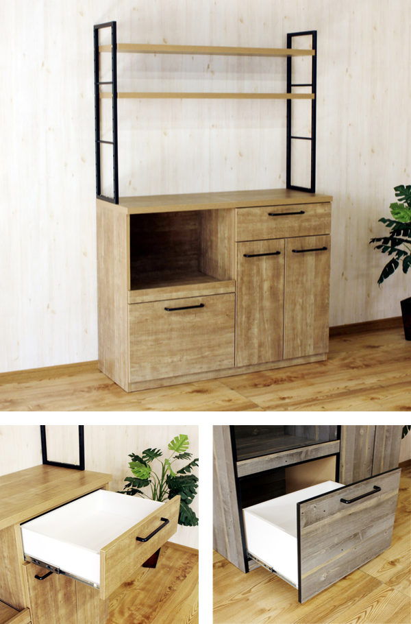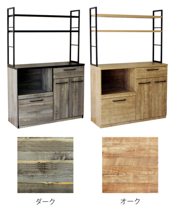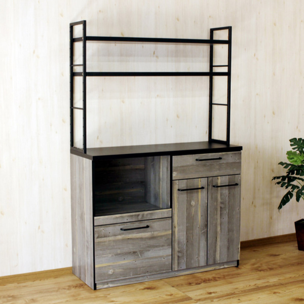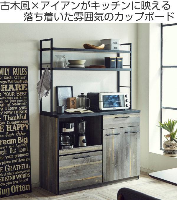 カップボード 古木調 オープンタイプ スチールフレーム 幅120cm ( 食器棚 レンジ台 引き出し収納 カウンター 日本製 完成品 家電ラック 棚付き キッチンボード 収納ラック 収納 アイアン 木目柄 おしゃれ レンジ台 食器棚 完成品)