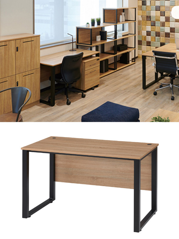 ●木目調の風合いの天板に、黒をきかせたスチールの異素材の組合せがスタイリッシュなデスクです。