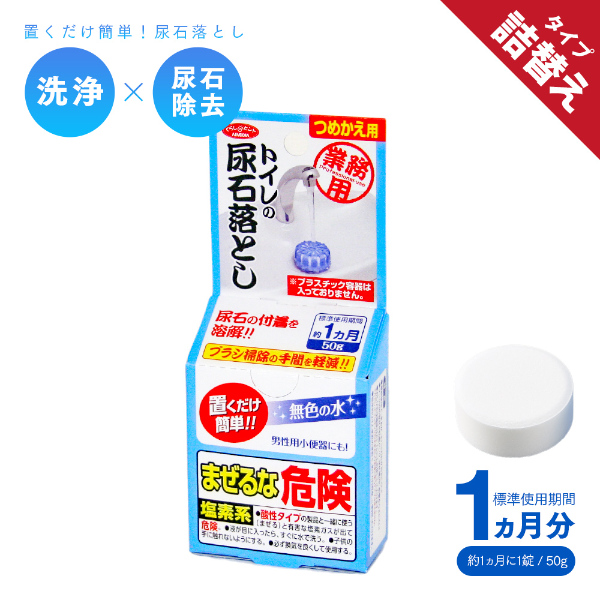 置くだけ簡単!尿石の付着を溶解!面倒なブラシ掃除の手間を軽減します。継続使用で、水あか、キバミ汚れが付きにくい!タンク内の器具や防露タンク、浄化槽内に影響を与えにくい!おしり洗浄機能付きトイレにもお使いいただけます。