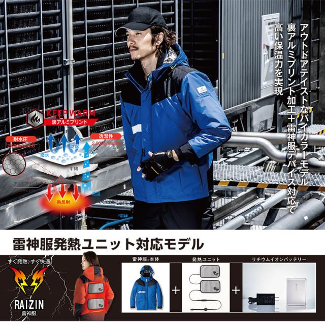 雷神服発熱ユニットデバイス対応、裏アルミプリント、耐水圧 2000mm/H2O、透湿性 2000g/m2/24h、反射素材、撥水加工、大型フード/ヘルメット対応型、フード:スピンドル、左腕/反射ワッペンペン差し、両胸/ ポケット、サイドポケット付きアウトポケット、カフス:アジャスター、内ポケット、裾:ドローコード