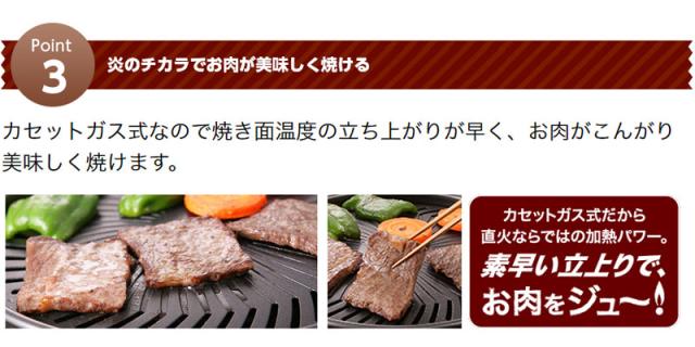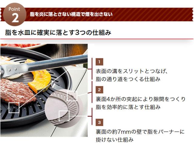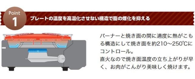 ・プレートの焼面温度を210〜250℃に保つことで、肉の脂が煙化することを抑制します。さらに炎に脂が当たらない構造なので、焼肉中の煙の発生を抑制することができる焼肉専用器です。※特許取得
