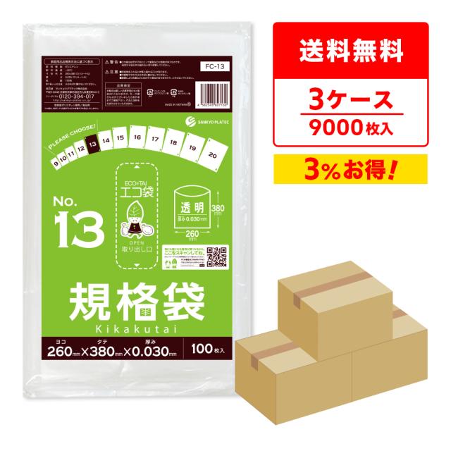 【まとめて3ケース】FC-13-3 規格袋 13号 0.030mm厚 透明 100枚x30冊x3箱 食品衛生法 RoHS指定 送料無料