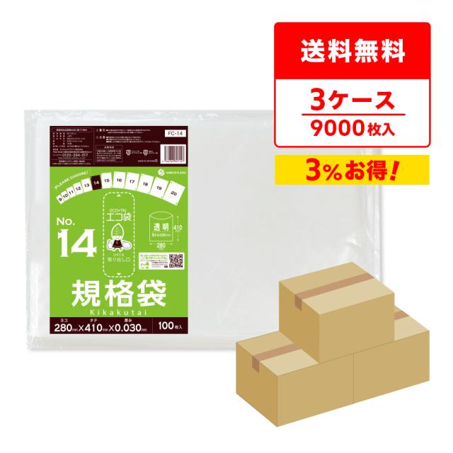 【まとめて3ケース】FC-14-3 規格袋 14号 0.030mm厚 透明 100枚x30冊x3箱 食品衛生法 RoHS指定 送料無料