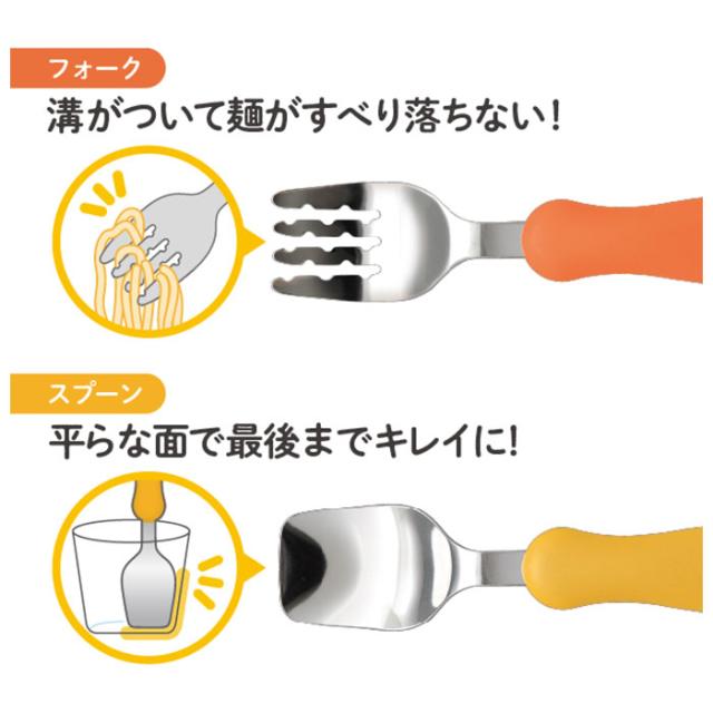 | 注意点 | [対象年齢]1歳半から ※必ず保護者や指導者の目の届く所でご使用ください。 ※用途目的以外のご使用はおやめください。 ※キズ・破損・亀裂・変形などが生じた場合は、すぐにご使用をおやめください。部品などを飲み込まれた場合は、病院や医師にご相談ください。 ※持ったまま転ぶと、目やのどに当たり思わぬケガをするおそれがあります。 ※フォークの隙間に指や舌、歯を入れないようにご注意ください。 ※初めてご使用される前に、必ず洗浄をしてください。 ※ご使用後は必ず洗浄をしてください。洗浄の際は柔らかいスポンジと食器用洗剤をご使用ください。磨き粉やたわしなどのご使用はおやめください。 ※洗浄後はよく乾燥させ、お子様の手の届かない所に保管してください。 ※麺はフォークの奥までしっかりからませてご使用ください。麺の細さや状態によっては麺が落ちる場合があります。 ※直火・オーブングリル・電子レンジではご使用いただけません。 ※火のそばに置かないでください。 ※塩素や酸などを含んだ汚れが付着したまま放置しないでください。また、鉄やアルミなど異種金属製品と接触させたまま長時間放置しないでください。サビの原因となります。 ※使用条件と使用頻度により劣化の時期は異なります。 ※本製品の仕様は改善・改良のため、予告なく変更することがあります。 ※煮沸消毒は大きめの鍋にお湯を入れ、鍋の内側に触れないように2〜3分間煮沸してください。 ※薬液消毒は各消毒用品の使用方法に従ってください。 ※食器洗浄機や食器乾燥機をご使用の際は、各使用方法に従ってください。 ※業務用の食器洗浄機や食器乾燥機でのご使用はおやめください。 ※漂白の際は台所用酸素系漂白剤を使用し、各使用方法に従ってください。 ※カメラやモニターの性質により、画像と実物の色の違いがある場合がございますのでご理解願います。 |