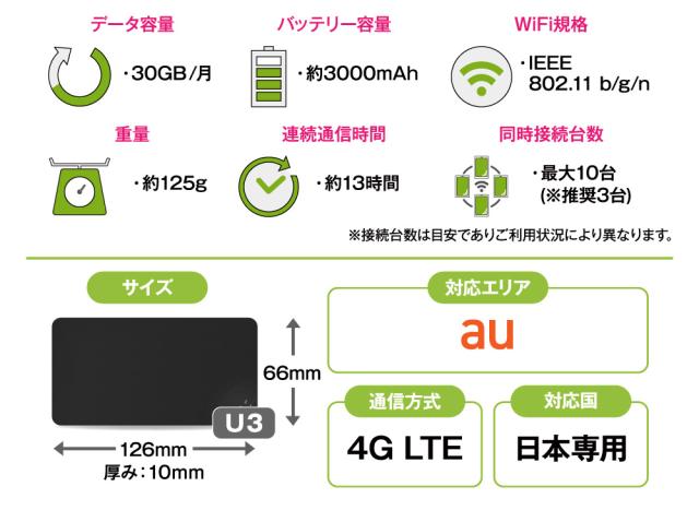 wifi レンタル ポケットwi-fi 30GB レンタルwi-fi 90日 3ヵ月 au エーユーU3 入院 引っ越し 旅行