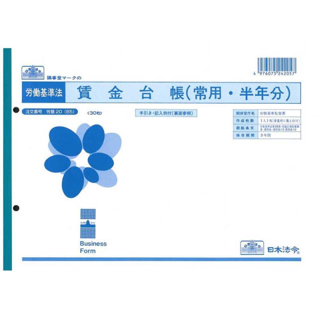 本商品は、常時労働者(日々雇い入れられる者でも1カ月を超えて引き続き使用される労働者を含む)を使用する事業場において調整し、備え付けて置かねばならない様式(賃金台帳)です。