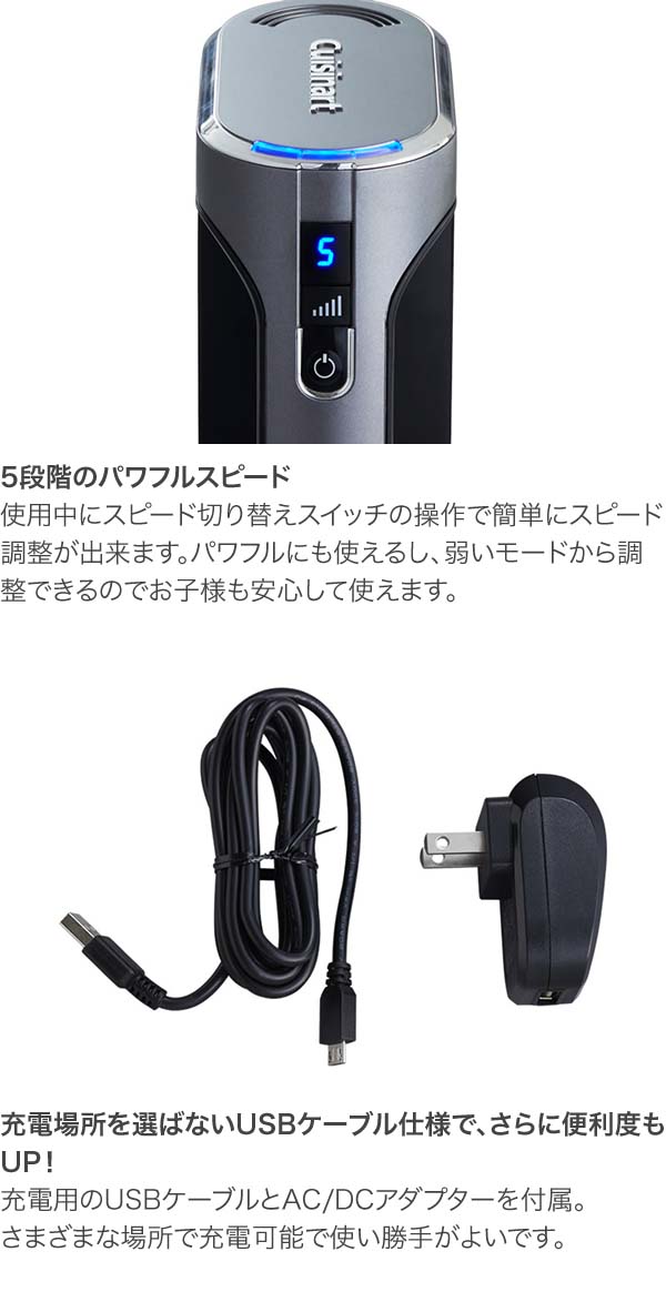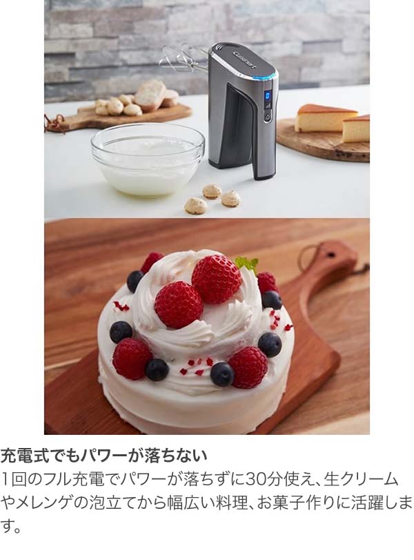 電源コードからの解放 パワーも場所も諦めない コードがないからどこでも持ち運べる。コードを気にせずお子様とのお菓子作りにも最適。 充電式なので、コンセントが少ないキッチンや、リビングでお子様とお菓子作りに挑戦することも出来ます。 コードレスだと使う場所が広がります。 そのまま立てて置ける 本体をテーブルに縦に置けるので、作業中の材料追加の際や、ちょっと他のことをしたい時に気にせず置けてストレスフリーです。 5段階のパワフルスピード 使用中にスピード切り替えスイッチの操作で簡単にスピード調整が出来ます。 パワフルにも使えるし、弱いモードから調整できるのでお子様も安心して使えます。 充電場所を選ばないUSBケーブル仕様で、さらに便利度もUP! 充電用のUSBケーブルとAC/DCアダプターを付属。 さまざまな場所で充電可能で使い勝手がよいです。 安心のダブルロック構造 電源ボタンとスピード切り替えスイッチの2段階操作で誤作動防止の安心設計。 充電式でもパワーが落ちない 1回のフル充電でパワーが落ちずに30分使え、生クリームやメレンゲの泡立てから幅広い料理、お菓子作りに活躍します。 スタイリッシュなデザイン 収納しやすいコンパクトなサイズなのに、そのスタイリッシュさが思わず片付けずに置いておきたくなるデザイン。 充電量をお知らせするLEDランプもダークグレイの本体に映えます。