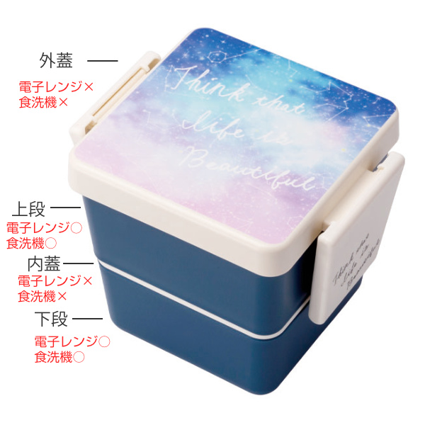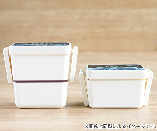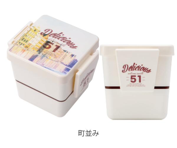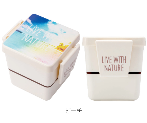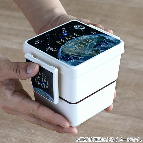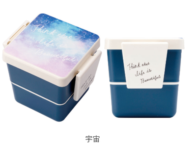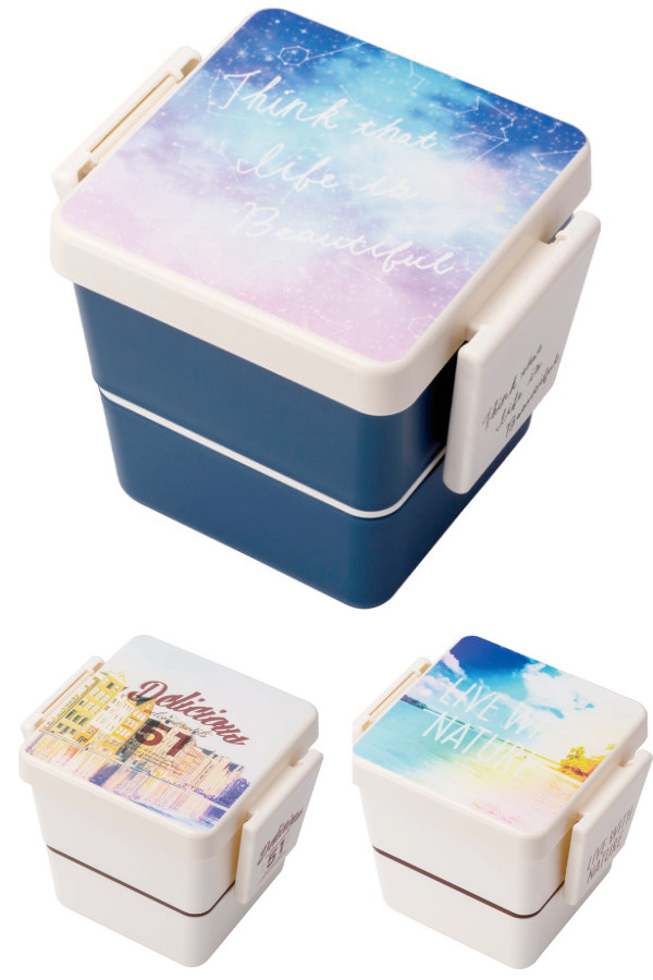 スクエア型の2段ランチボックスです。美しい写真にロゴがプリントされたデザインが特徴です。柄は宇宙、町並み、ビーチの3種類からお選びいただけます。本体は日本製で、マットな質感です。