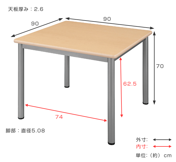 | サイズ | 約 幅90×奥行90×高さ70(cm) 天板厚み:2.6(cm) 脚部:直径5.08(cm) |
