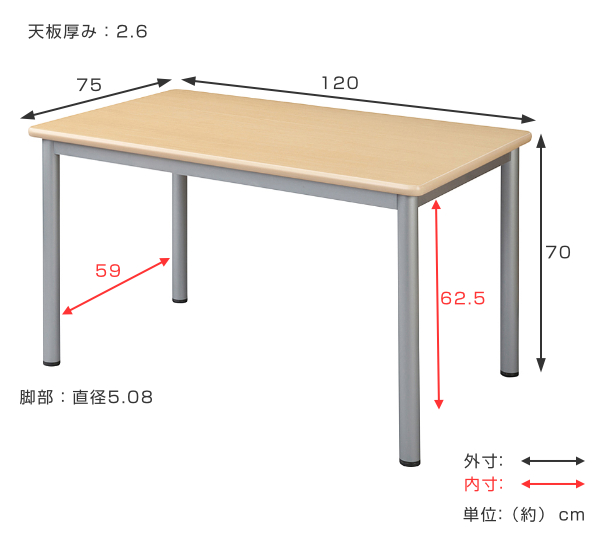 | サイズ | 約 幅120×奥行75×高さ70(cm) 天板厚み:2.6(cm) 脚部:直径5.08(cm) |