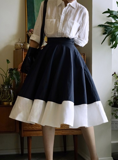 フレアスカート ハイウェストスカート ひざ丈 無地 ネイビー 白 バイカラー Aライン 春夏 仕事 可愛い シンプル 人気 10代 20代 30代 お出かけ デート 上品 きれいめ キュート 清楚 大人女子 OL オフィス トレンド