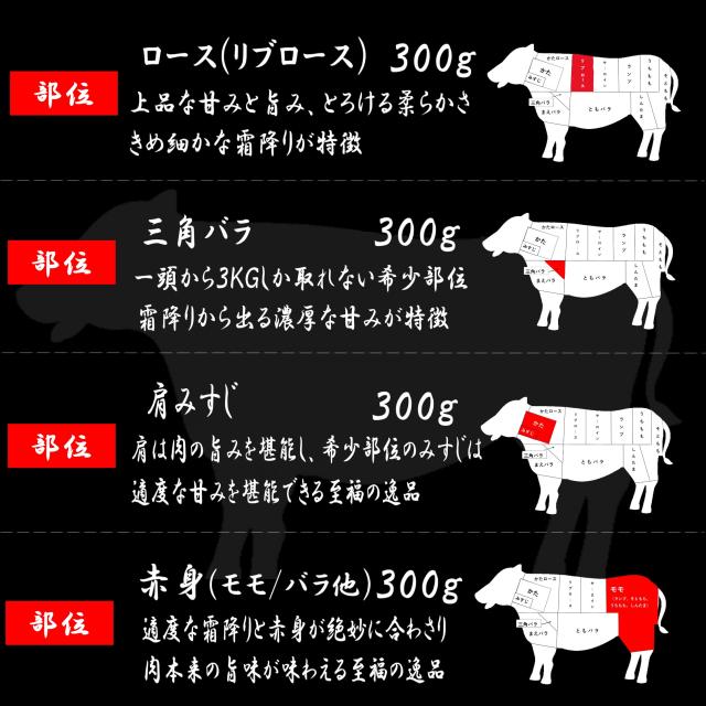 ロース(リブロース)、三角バラ、肩みすじ、赤身の4種類