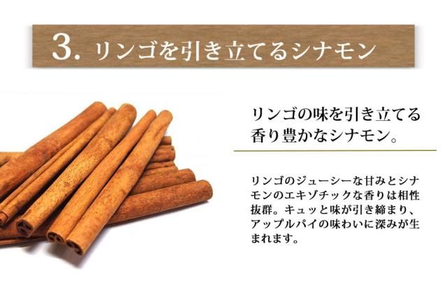 | 原材料 | リンゴプレザーブ(りんご(国産)、砂糖、水飴、その他)、 パイ生地(小麦粉、発酵バター、食塩)、フラワーペースト(菜種油、水飴、しょ糖液糖、乳調製品、その他)、 卵、砂糖、小麦粉、アプリコットジャム、マーガリン、シナモン、麦芽糖、寒天/加工澱粉、乳化剤、酸味料、グリシン、 香料、膨張剤、酸化防止剤(V.C)、増粘多糖類、保存料(ソルビン酸)、着色料(カロテン、V.B2)、乳酸Ca、pH調整剤、 ゲル化剤(ペクチン)、(一部に卵・乳成分・小麦・大豆・りんごを含む) |