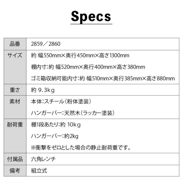 ■耐荷重:各棚/約10kg ハンガーバー/約2kg