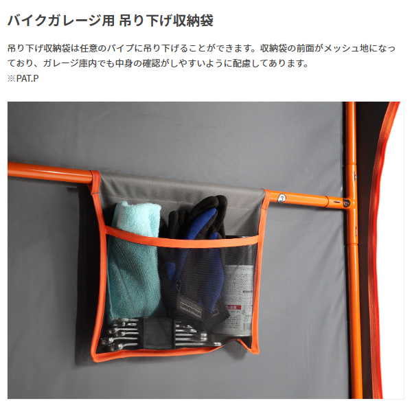 吊り下げ収納袋は任意のパイプに吊り下げることができます。収納袋の前面がメッシュ地になっており、ガレージ庫内でも中身の確認がしやすいように配慮してあります。