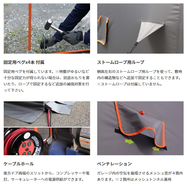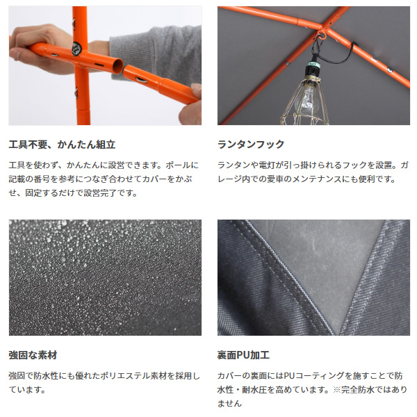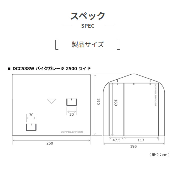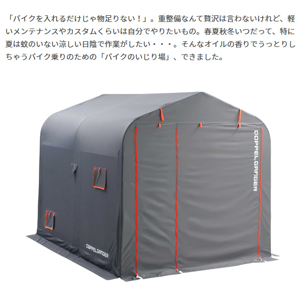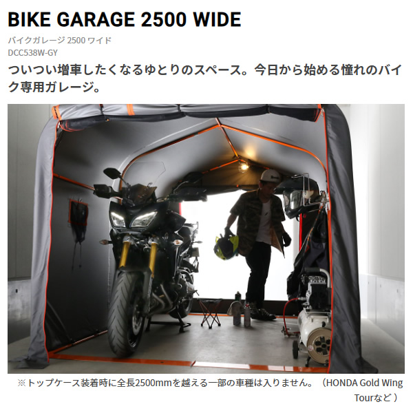BIKE GARAGE 2500 WIDEバイクガレージ 2500 ワイドDCC538W-GYついつい増車したくなるゆとりのスペース。今日から始める憧れのバイク専用ガレージ。「バイクを入れるだけじゃ物足りない!」。重整備なんて贅沢は言わないけれど、軽いメンテナンスやカスタムくらいは自分でやりたいもの。春夏秋冬いつだって、特に夏は蚊のいない涼しい日陰で作業がしたい・・・。そんなオイルの香りでうっとりしちゃうバイク乗りのための「バイクのいじり場」、できました。■カラー:グレー・オレンジ■原産国:中国■サイズ:W195 ×L(D)250 ×H190cm■製品総重量(付属品含む):23kg■パイプ径:20mm■材質:生地:ポリエステルフレーム:スチール■組立て推奨人数:2人以上■お客様組立目安時間:60分お客様に別途ご用意いただく必要がある工具:ゴムハンマー(組立て用)※記載は商品仕様の一部です。仕様説明不足等の理由での返品はできません。特に適合等は必ずご確認ください。