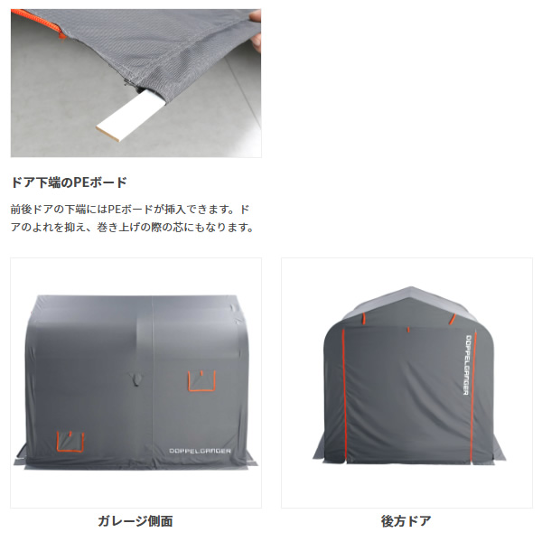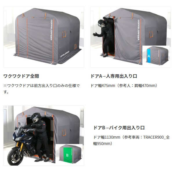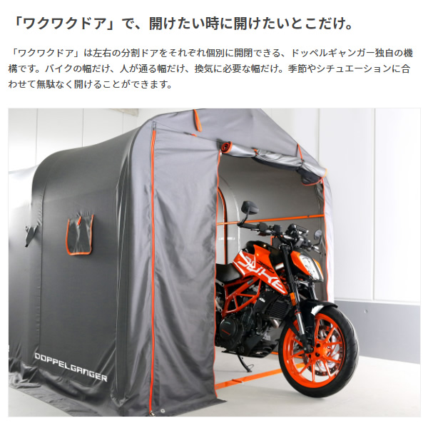 「ワクワクドア」は左右の分割ドアをそれぞれ個別に開閉できる、ドッペルギャンガー独自の機構です。バイクの幅だけ、人が通る幅だけ、換気に必要な幅だけ。季節やシチュエーションに合わせて無駄なく開けることができます。