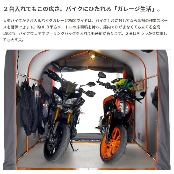 大型バイクが2台入るバイクガレージ2500ワイドは、バイク1台に対してなら余裕の作業スペースを確保できます。約4.8平方メートルの床面積を持ち、庫内でかがまなくても立てる全高190cm。バイクウェアやツーリングバッグを入れても余裕があります。2台目をうっかり増車しても大丈夫。