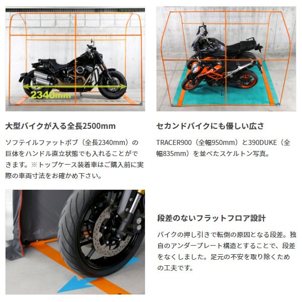 ついつい増車したくなるゆとりのスペース。今日から始める憧れのバイク専用ガレージ。
