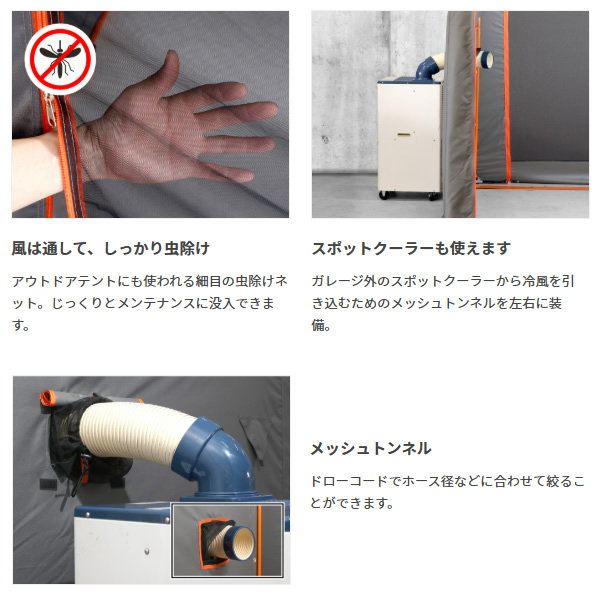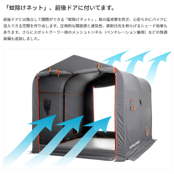前後ドアとは独立して開閉ができる「蚊除けネット」。蚊の猛攻撃を防ぎ、心安らかにバイクに没入できる空間を作り出します。圧倒的な開放感と通気性、直射日光を和らげるシェード効果もあります。さらにスポットクーラー用のメッシュトンネル(ベンチレーション兼用)などの快適装備も追加しました。