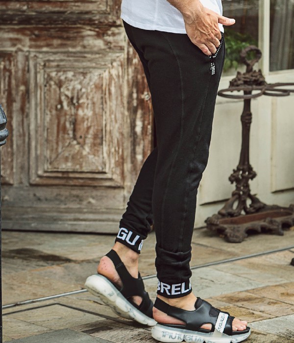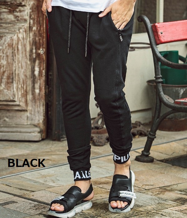 ウエストと裾口にロゴを配することでスポーティな印象を形成。さらにポケットにラインストーンファスナーを採用しラグジュアリーなアイテムに仕上がりました。