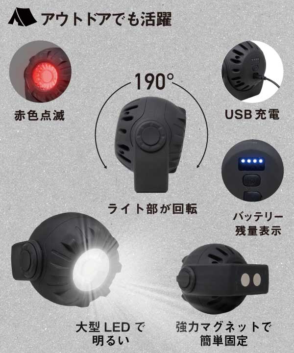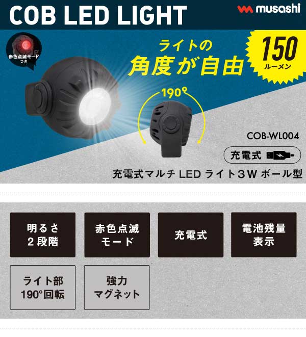 ムサシ 充電式マルチLEDライト 3Wボール型 USB充電 コンパクト 携帯ライト アウトドア キャンプ COBライト ランタン 作業灯 現場 防犯ライト スポットライト 照明 スタンド付き マグネット