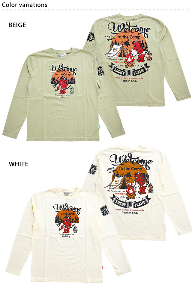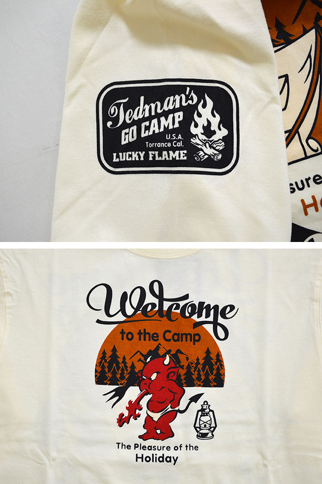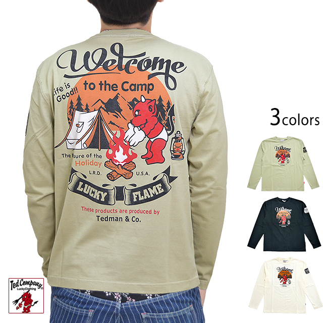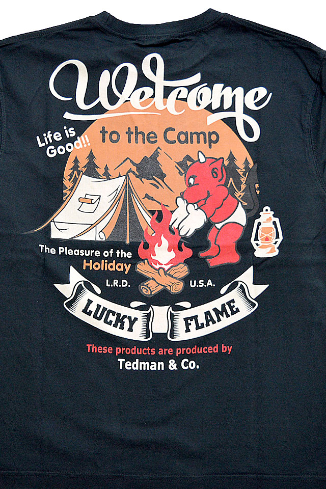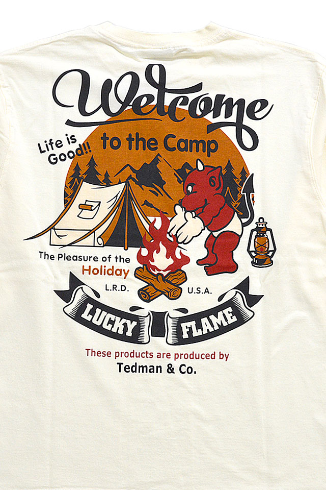テッドマンから「CAMP長袖Tシャツ(TDLS-343)」のご紹介です! テッドマンシリーズでは初のジャンル、キャンプテッドマンが登場しました! 背中には、テントのそばで起こした火で暖をとるテッドマンを描きました。随所まで細かく描き込みが施されており、見ているだけでも楽しくなる絵柄です。 生地には、テッドマンお馴染のよれにくくタフなボディーを採用しました。 | ||||||||||||||||||||||||||||||
