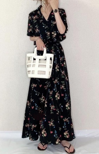 シャツワンピース 細見え 春夏 夏 普段使い 綿 ルーム お出かけ デート リゾート 黒 Vネック 花柄 大人 清楚 可愛い 上品 クール ゆったり Aライン 半袖 ロング丈 人気 トレンド 10代 20代 30代