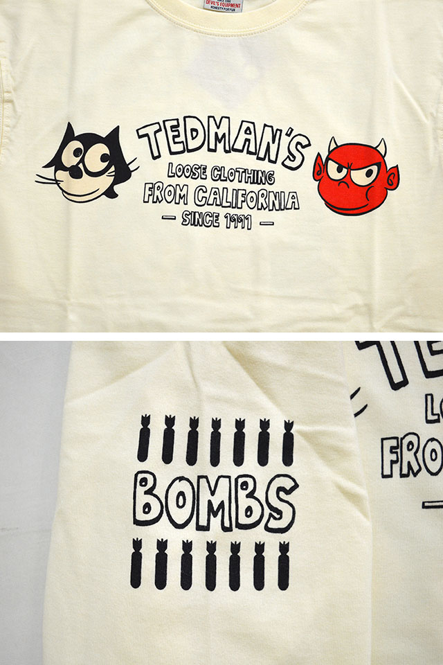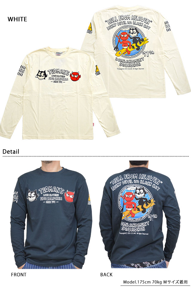 テッドマンから「ユルユルその弐長袖Tシャツ(TDLS-347)」のご紹介です! 半袖で好評だったデザインが長袖にスタイルチェンジして登場しました! ラッキーデビルをユルいタッチで描いた今回の作品。 背中には、ゆるいタッチで描かれたテッドマンと有名なキャラクターによく似た黒猫が並んでいます。 フロント中央には、手書き風ロゴにテッドマンと黒猫のアイコンをプリント。 フロント中央にはテッドマンのアイコンをワンポイントでプリント。 生地には、テッドマンお馴染のよれにくくタフなボディーを採用しています。 | ||||||||||||||||||||||||||||||