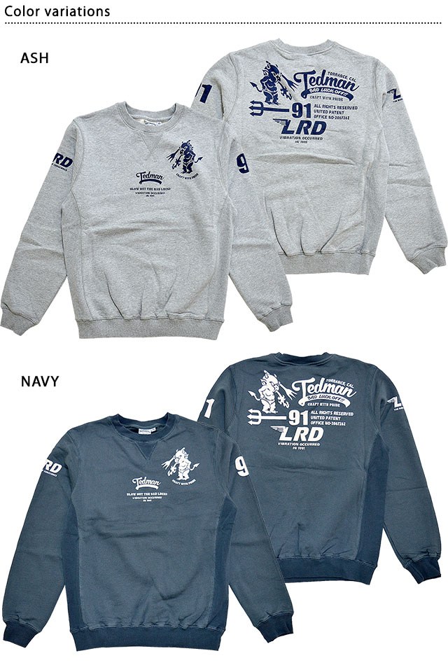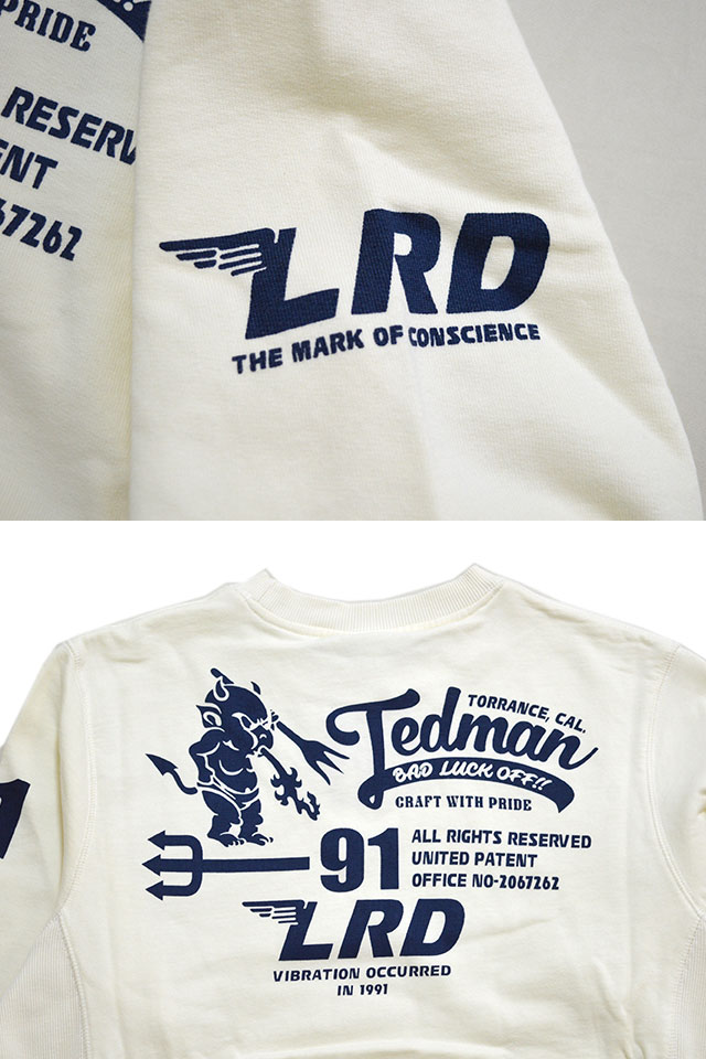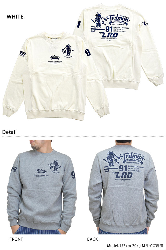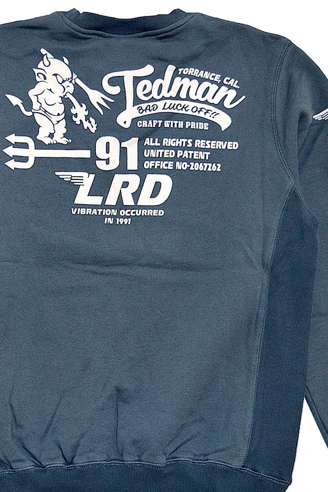 テッドマンから「スウェットトレーナー(TDSW-1180)」のご紹介です! テッドマン定番のデザインを背中に落とし込んだ、アメカジ全開のクルーネックスウェットが登場! 右袖には「LUCKY RED DEVIL」の頭文字を取ったモチーフやレタードを、左袖にはナンバーをワッペン風にプリント。 襟元にはガゼット。 | |||||||||||||||||||||||||
