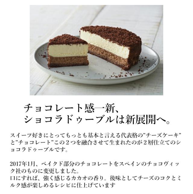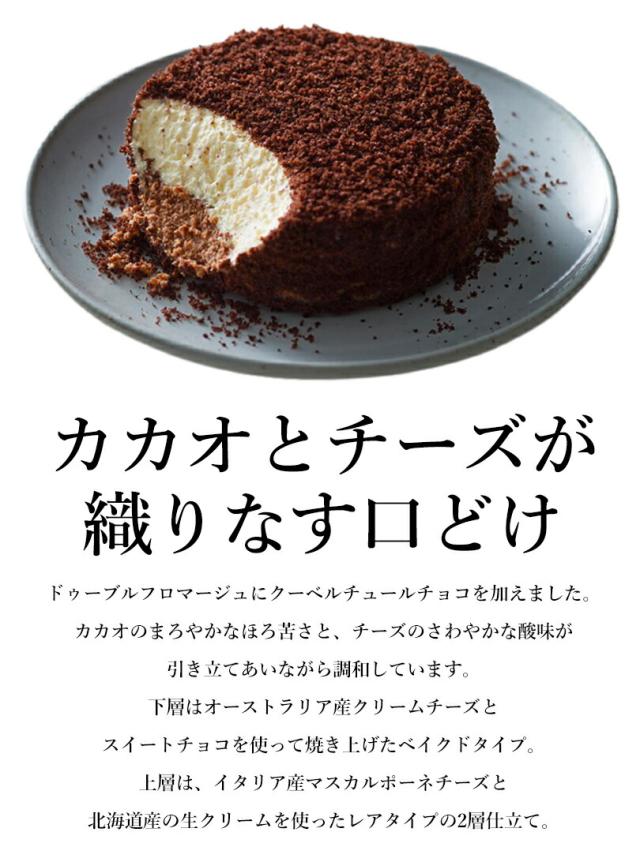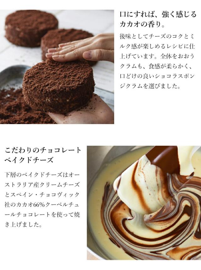 ベイクド部分のチョコレートをスペインのチョコヴィック社のものに変更しました。 口にすれば強く感じるカカオの香り。後味としてチーズのコクとミルク感がたのしめるレシピに仕上げています。 全体をおおうクラムも食感が柔らかく、口どけの良いショコラスポンジクラムを選びました。