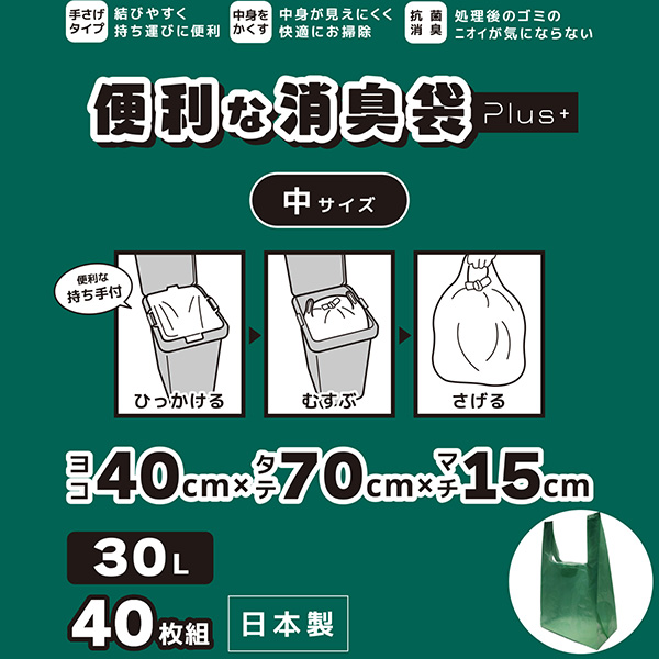 送料無料 便利な消臭袋 PLUS+ ゴミ袋 プラス 30L 40枚組 日本製 柿渋 抗菌 消臭 高機能フィルム 消臭袋 取っ手付き 生ごみ袋 キッチン オムツ ペット におわない 脱臭 SPP-10261