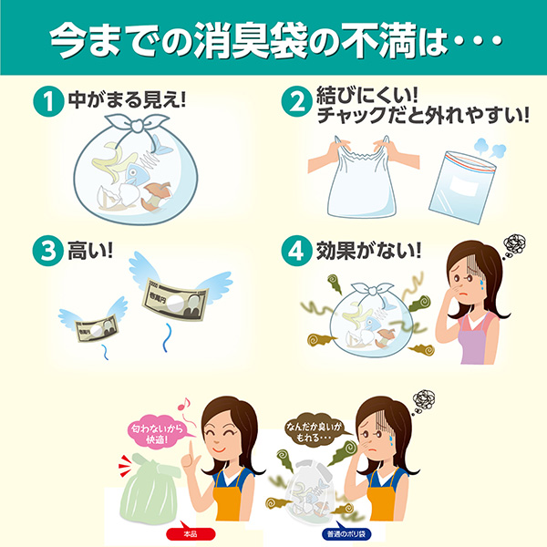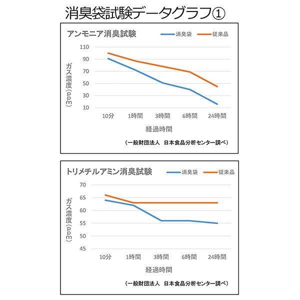 従来の消臭袋に抗菌効果を追加しパワーアップしました!渋柿より抽出した天然由来ポリフェノールの抗菌・消臭効果をポリエチンフィルムに添加した高性能で安全な高機能フィルム“ショウブリーズ”を使用。菌や悪臭を化学反応により除去します。