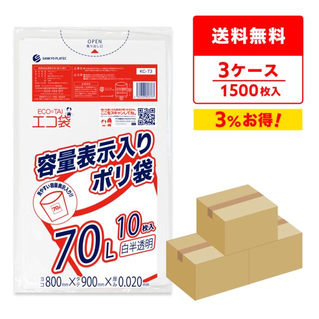 【まとめて3ケース】KC-73-3 東京都容量表示ポリ袋 70リットル 0.020mm厚 白半透明 10枚x50冊x3箱/ ゴミ袋 ごみ袋 送料無料